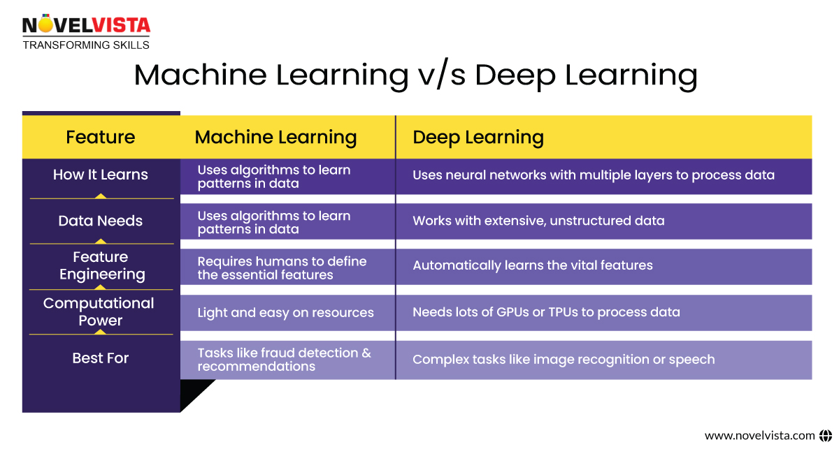 Let’s start with a quick comparison! Machine learning and Deep Learning are part of Artificial Intelligence, but they approach problems a bit differently.