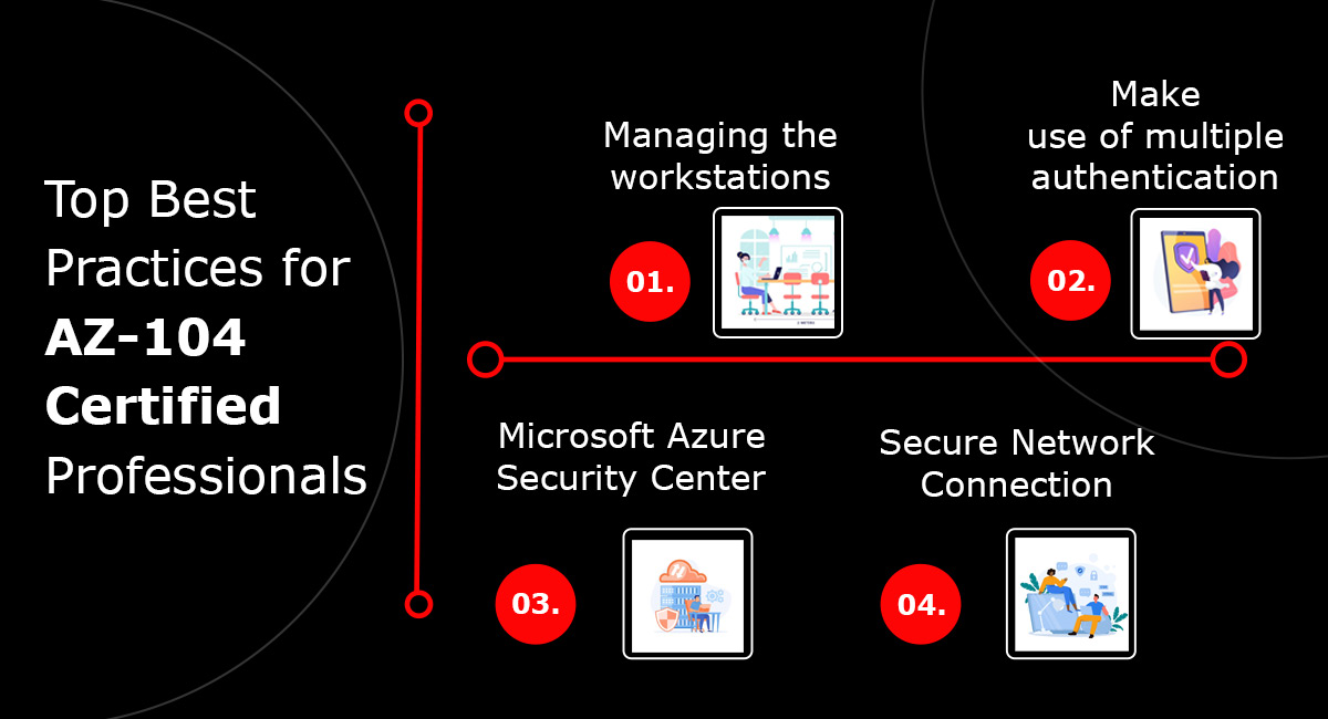Azure Security best practices for AZ-104 Certified professionals include the development of Multi-Factor Authentication, Securing Administrator Access, Managing Workstations, and making effective use of Azure Security Center.