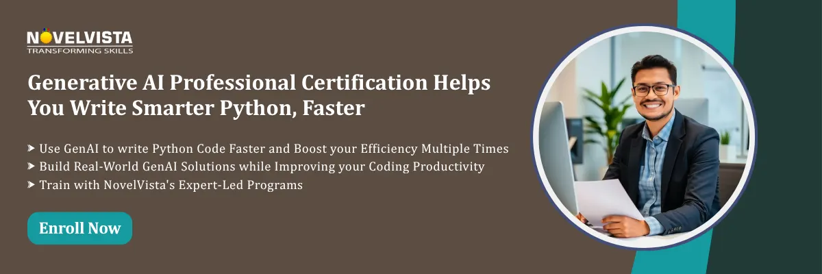 NovelVista's Generative AI Professional Certification takes your Python knowledge further, covering LLM integration, RAG pipelines, agent frameworks, and production deployment in a structured, hands-on curriculum built around what hiring managers actually look for in 2026.