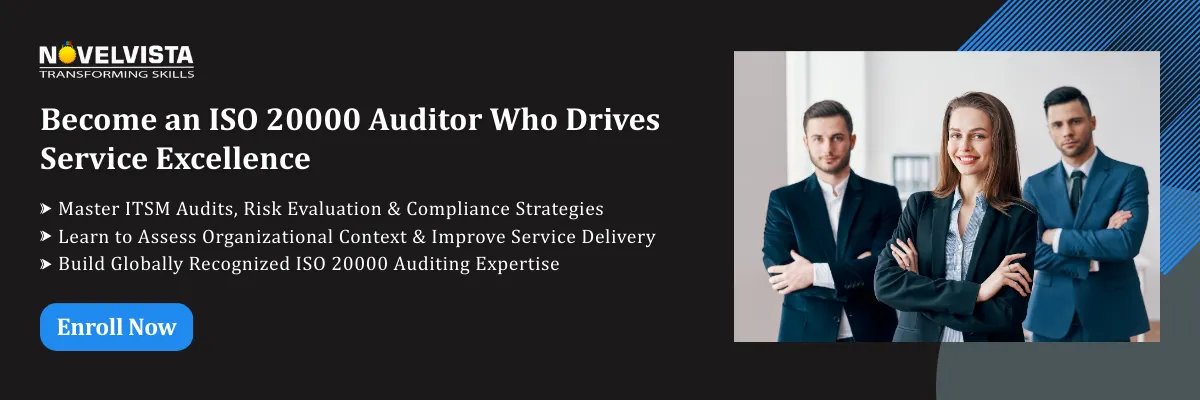 Join NovelVista’s ISO/IEC 20000:2018 Lead Auditor Certification Training and gain hands-on auditing skills, practical insights into real-world ITSM scenarios, and globally recognized credentials. Designed for IT managers, auditors, and service professionals, this program empowers you to confidently assess, implement, and optimize the context of the organization ISO 20000 while driving service excellence.
