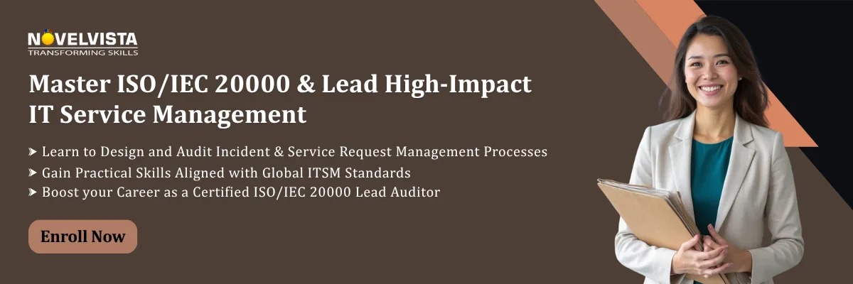 Join NovelVista’s ISO/IEC 20000:2018 Lead Auditor Certification Training and build hands-on auditing skills, practical service management knowledge, and globally recognized credentials. Designed for IT leaders and ITSM professionals, this course empowers you to confidently assess, improve, and lead Incident and Service Request Management processes in alignment with ISO/IEC 20000. Step into a role where you don’t just manage services you elevate them.