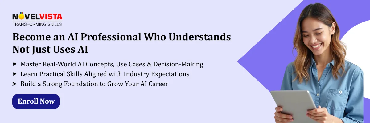 Join NovelVista’s AAIA Certification Training and gain practical knowledge of AI fundamentals, real-world use cases, and industry-relevant skills that go beyond theory. Designed for beginners and IT professionals alike, this course complements your AAIA Study Guide with expert-led sessions, structured AAIA Study Material, and a results-driven AAIA Study Plan helping you confidently prepare using a proven AAIA Certification Exam Guide.